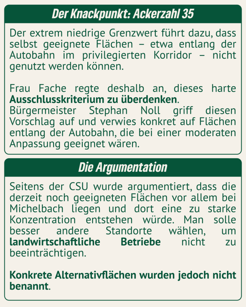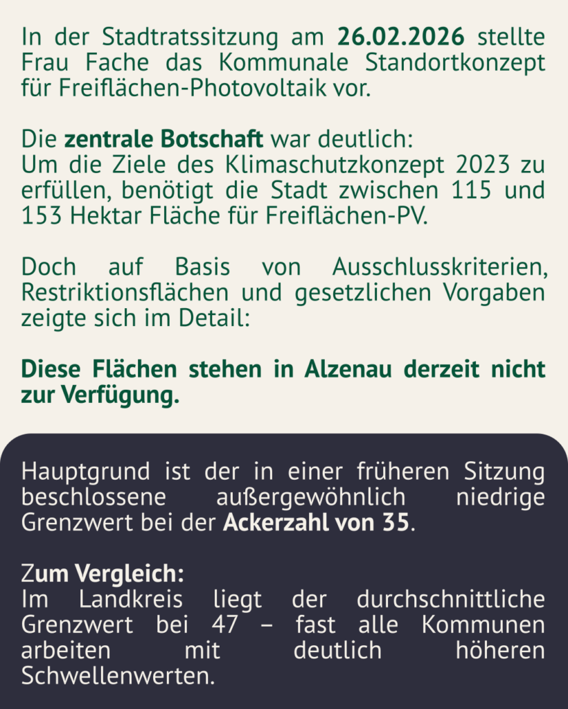 Besonders scharf kritisieren wir das Abstimmungsverhalten von CSU, FDP und Freie Wähler/PWG. Mit ihrer Zustimmung zu dieser Einschränkung haben diese Fraktionen faktisch gegen den Klimaschutz gestimmt. Sie führen die Umsetzung des Alzenauer Klimaschutzkonzeptes ad absurdum, zentrale Maßnahmen zur Emissionsminderung werden damit aktiv blockiert und der notwendige Ausbau erneuerbarer Energien vor Ort unnötig verhindert. Der Beschluss sieht vor, Photovoltaik-Anlagen auf Ackerflächen nur noch bis zu einer sogenannten Ackerzahl von 35 zuzulassen. Damit werden zahlreiche geeignete Flächen pauschal ausgeschlossen – ohne Einzelfallprüfung, ohne Rücksicht auf innovative Nutzungskonzepte und ohne Blick auf die dramatischen Folgen der Klimakrise. Für Bündnis 90/Die Grünen ist klar: Diese ideologisch motivierte Begrenzung wird weder den Anforderungen des Klimaschutzes noch den Interessen vieler Landwirtinnen und Landwirte gerecht.