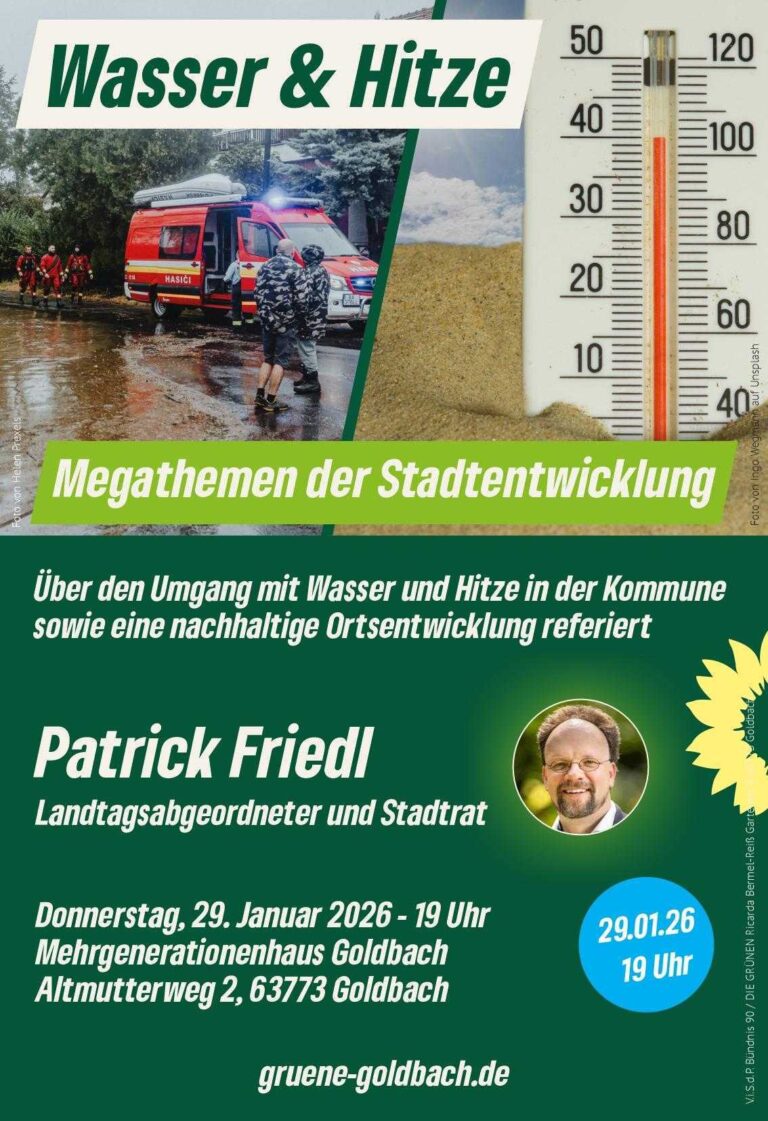 Patrick Friedl, MdL, Sprecher für Klimaanpassung, sowie Stadtrat in Würzburg, kommt am 29. Januar zu uns und kann uns zu diesen Themen Hintergründe, Fakten, Projekte und praktische Anleitungen vorstellen. Außerdem beantwortet er Fragen und diskutiert mit uns im Saal des Mehrgenerationenhauses LebensWert, Altmutterweg 2-4, 63773 Goldbach am 29. 01. 2026, um 19 Uhr.